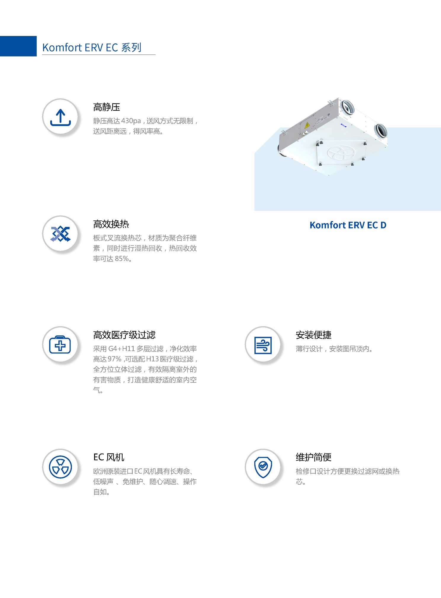 ● 高靜壓,靜壓高達430pa,保證末端新風量 ● 送風方式無限制,距離遠,風量大 ● 高熱效率,熱回收效率可達85% ● 高效醫療級過濾 ● EC風機,運行更安靜,更節能 ● 安裝便捷,維護簡便 ">